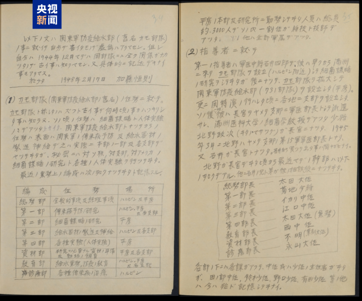 笔供证实了731部队的客观存在,还原了731部队的组织体系与职能分工,证实其犯罪运作的严密性。731部队下设8个核心部门,地点集中于哈尔滨、平房及其分支机构。平房特别军事营区约3000人,其中10%为军官和专业技术人员,其余为军事编制服役人员,形成“本部—部门—支队”的犯罪证据链。