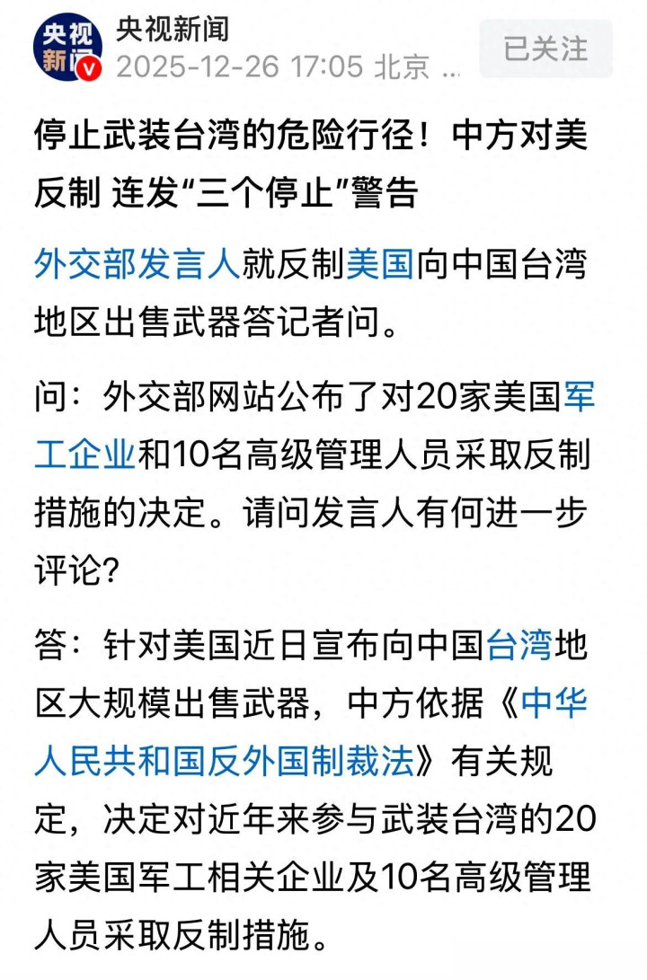 美方刚宣布对台大规模售武,中方立刻依据《反外国制裁法》甩出反制大招!精准锁定20家涉事美企和10名高管科元网,每一招都打在要害上!