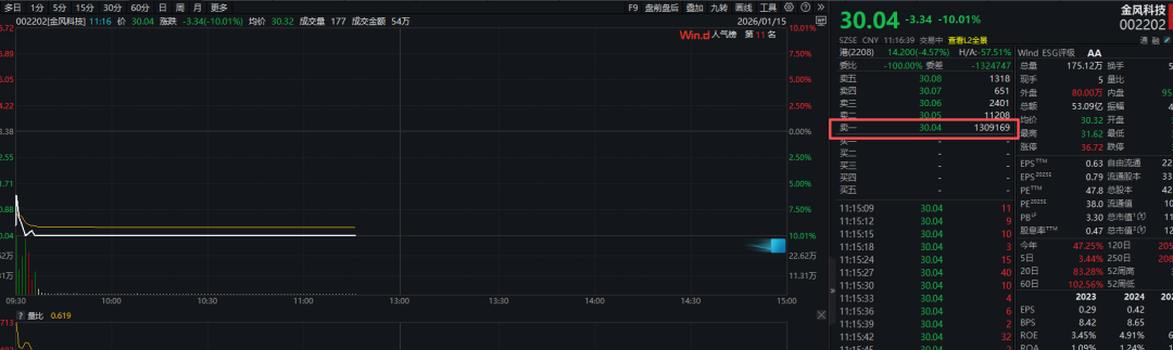 金风科技今天上午多数时间封住跌停,盘中卖一位置长时间出现约1.3亿股巨量卖单,相关卖单市值折合约39亿元。最近一段时间来,金风科技涨势凌厉,在一个月左右的时间里股价一度翻倍。