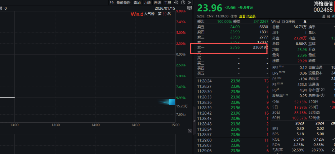 海格通信上午牢牢封住跌停,截至中午收盘卖一位置有近2.4亿股巨量卖单,上述卖单折合市值超过57亿元。