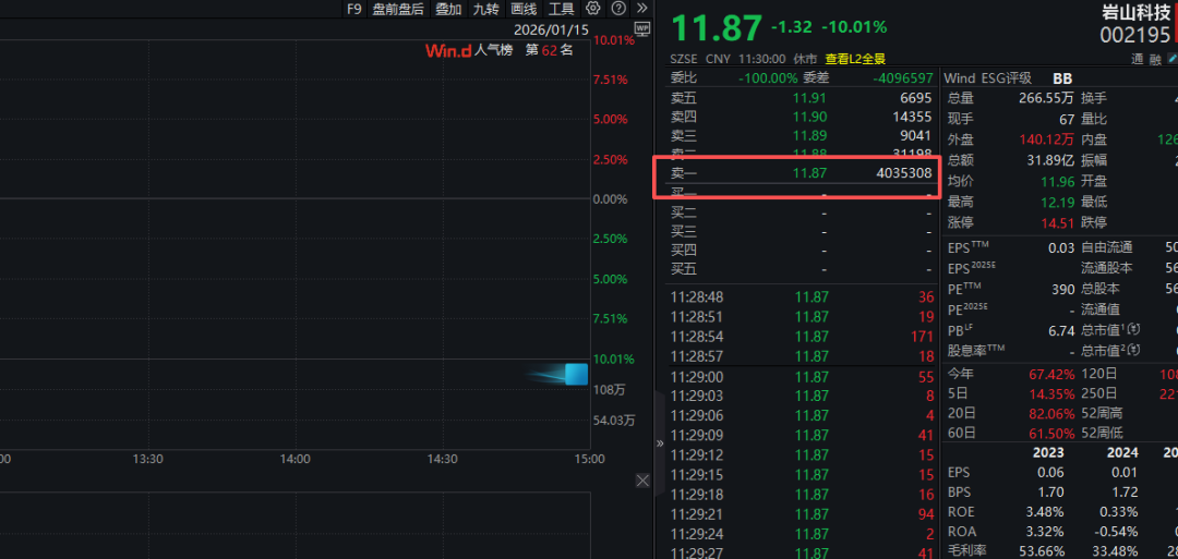 岩山科技今天上午多数时间牢牢封住跌停,盘中卖一位置长时间出现约4亿股巨量卖单,折合市值在48亿元左右。不久前,岩山科技股价曾连续涨停,为近期强势股之一,最近一个月股价也一度实现翻倍。